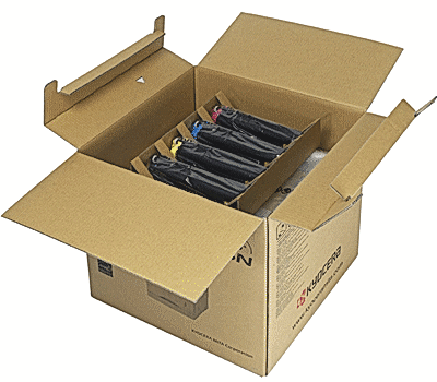 Orijinal bir KYOCERA toneri, toner kaseti içerisinde KYOCERA Document Solutions logosuna veya toner logomuzun da bulunduğu beyaz bir yazıdan oluşan yeşil bir KYOCERA Document Solutions etiketine sahiptir.